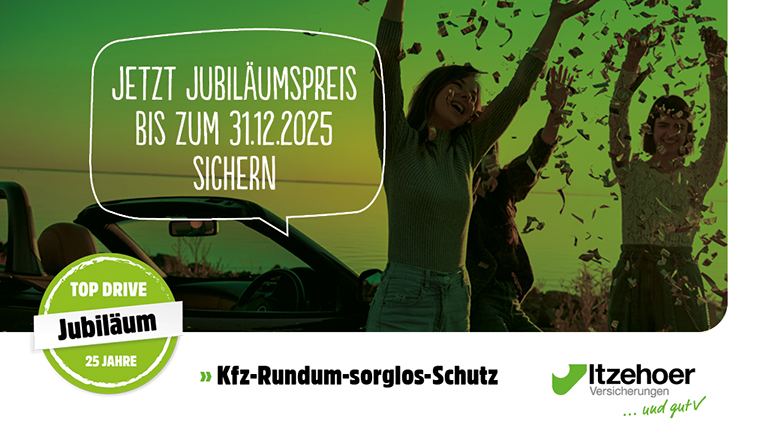 25 Jahre TOP DRIVE, das sind 25 Jahre Vertrauen auf Deutschlands Straßen. Feiern Sie mit und sichern Sie Ihren Kundinnen und Kunden bei Neuverträgen den marktführenden Kfz-Rundum-sorglos-Schutz der Itzehoer zum Jubiläumspreis – nur noch bis 31. Dezember.