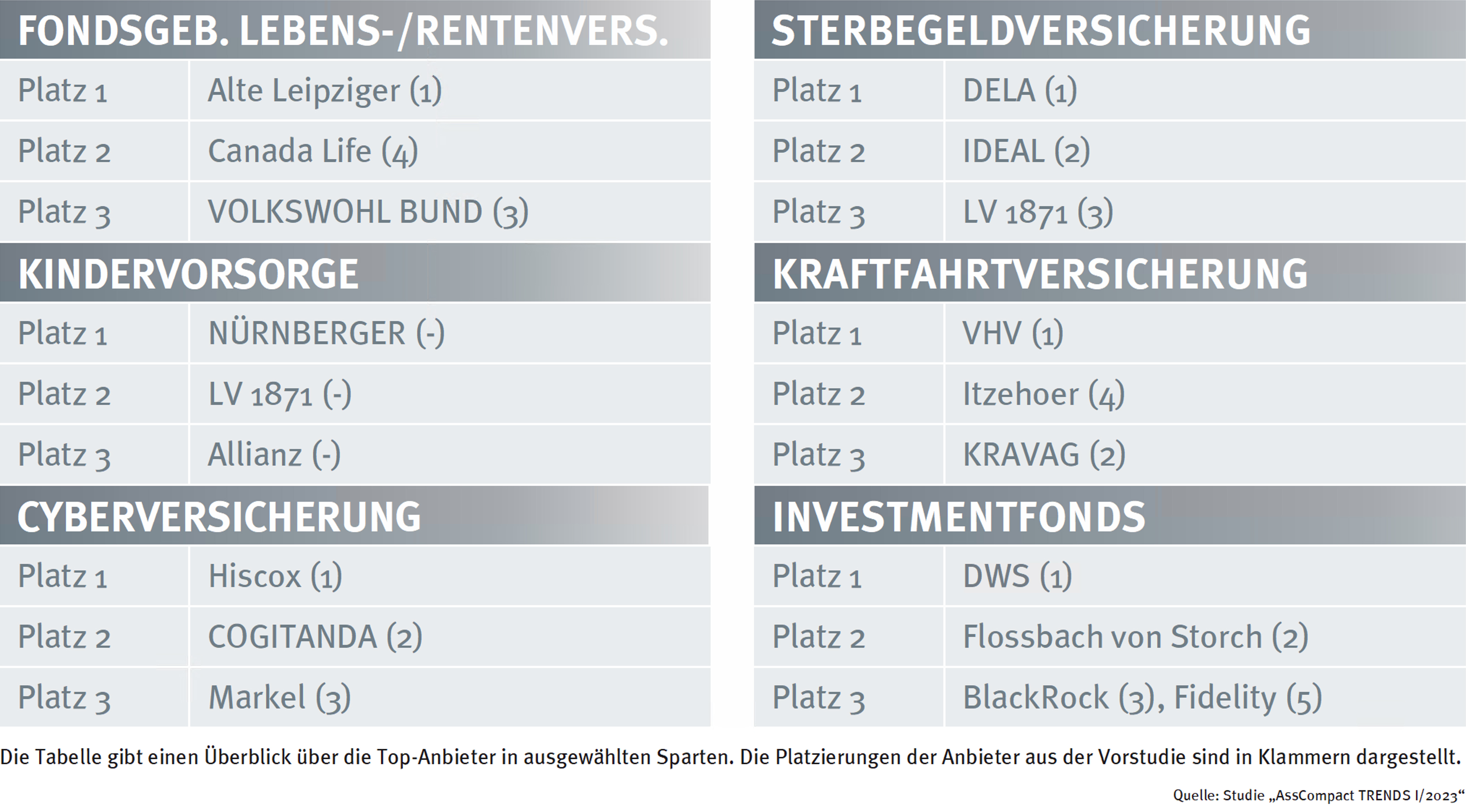 Die Tabelle gibt einen Überblick über die Top-Anbieter in ausgewählten Sparten. Die Platzierungen der Anbieter aus der Vorstudie sind in Klammern dargestellt.