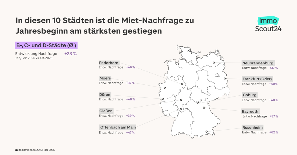 Die Nachfrage nach Mietwohnungen hat in vielen regionalen Zentren zum Jahresbeginn klar zugelegt. Einen besonders starken Anstieg weist Rosenheim auf mit 62%. Die oberbayerische kreisfreie Stadt im Alpenvorland führt somit die Rangliste der untersuchten Zentren mit den Stärksten Anstiegen der Mietnachfrage. Auf Platz 2 rangiert Offenbach am Main, wo die die Anfragen an Vermieter im Januar und Februar 2026 um 47% gegenüber dem vierten Quartal 2025 zugenommen haben. Steigerungen von über 40% sind außerdem in Paderborn (+46%, Rang 3), Düren (+41%, Rang 4), Frankfurt (Oder) (+40%, Rang 5) und Coburg (+40%, Rang 6) zu beobachten. Laut ImmoScout24 bewegen sich in diesen vier Städten die durchschnittlichen Angebotsmieten unter der Marke von 9 Euro pro Quadratmeter.