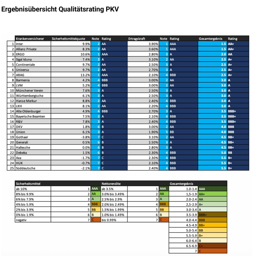 Die Sicherheitsmittelquoten rechnet der Analysehaus anschließend in Noten von 1,0 bis 7,0 und diese Note dann in Ratings von AAA bis C um. Die beiden am sichersten aufgestellte Versicherer sind ERGO und ARAG, die beide ein Rating von AAA erhalten.