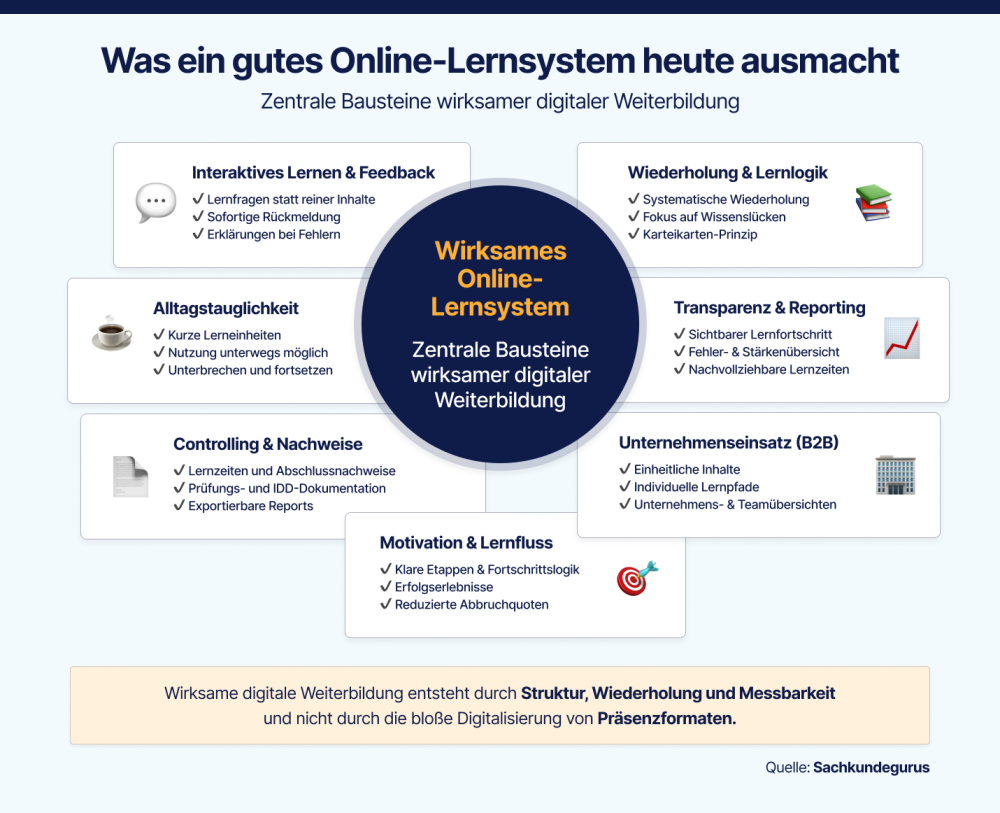 Damit unterscheidet sich digitale Weiterbildung grundlegend von klassischen Präsenzformaten – nicht nur im Medium, sondern vor allem im didaktischen Ansatz. Der Fokus verschiebt sich vom reinen Durcharbeiten von Inhalten hin zur aktiven Auseinandersetzung mit Wissen. Lernen wird messbar, nachvollziehbar und wiederholbar.