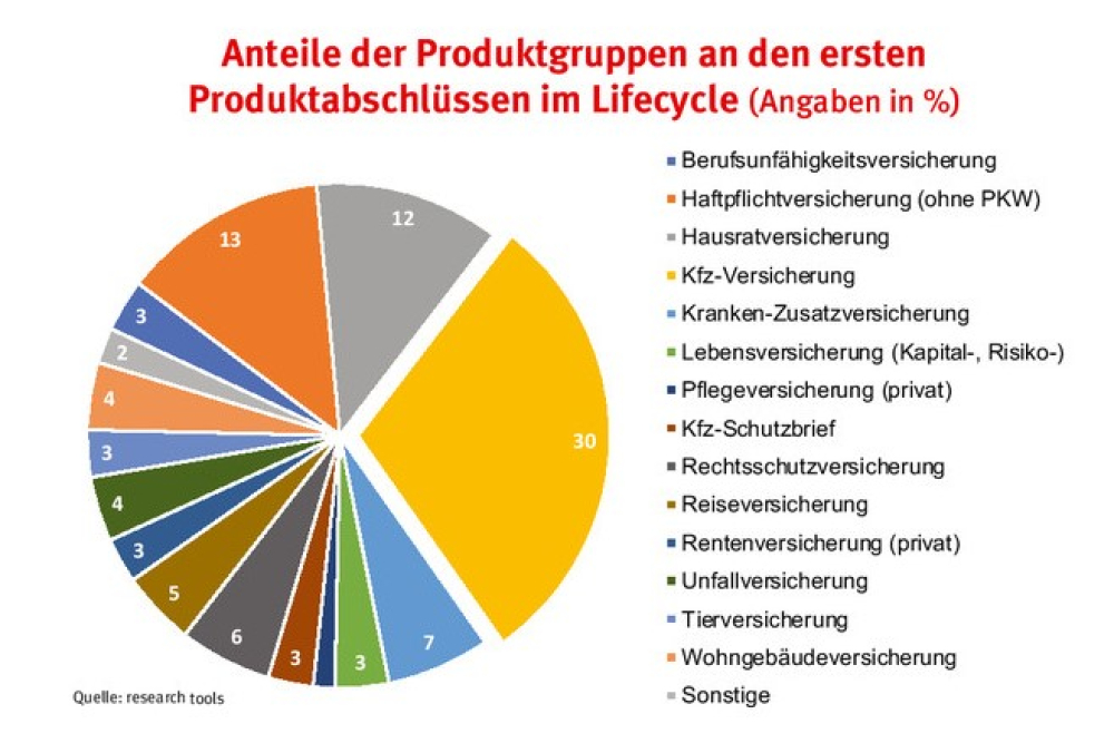 Die hohen Investitionen ins Marketing von Kfz-Versicherungen sind gemäß den Daten aus der Studie „Kundenpfade Versicherungen 2022“ sinnvoll, weil Kfz-Versicherungen mit einem Anteil von 30% besonders häufig das erste Versicherungsprodukt im Lifecycle sind. Die nächsthäufig als erste abgeschlossenen Versicherungsprodukte Haftpflicht- und Hausratversicherung kommen zusammen nur auf 25%.