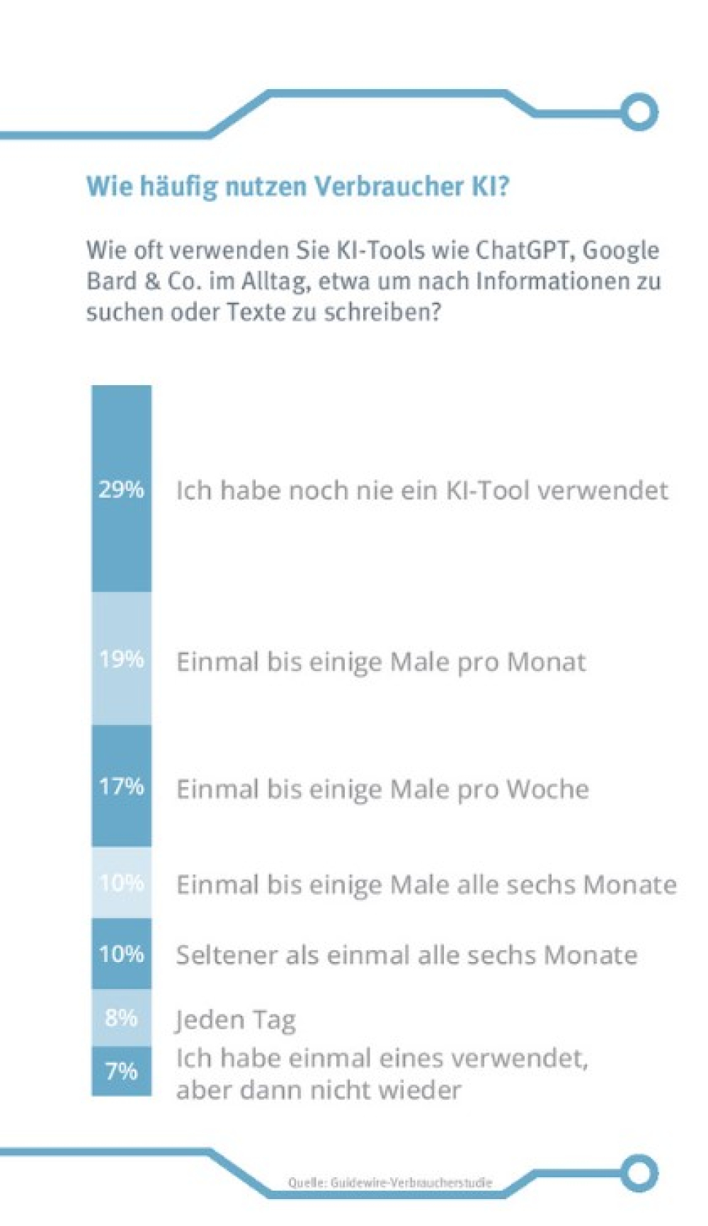Frage: Wie oft verwenden Sie KI-Tools wie ChatGPT, Google Bard & Co. im Alltag, etwa um nach Informationen zu suchen oder Texte zu schreiben?