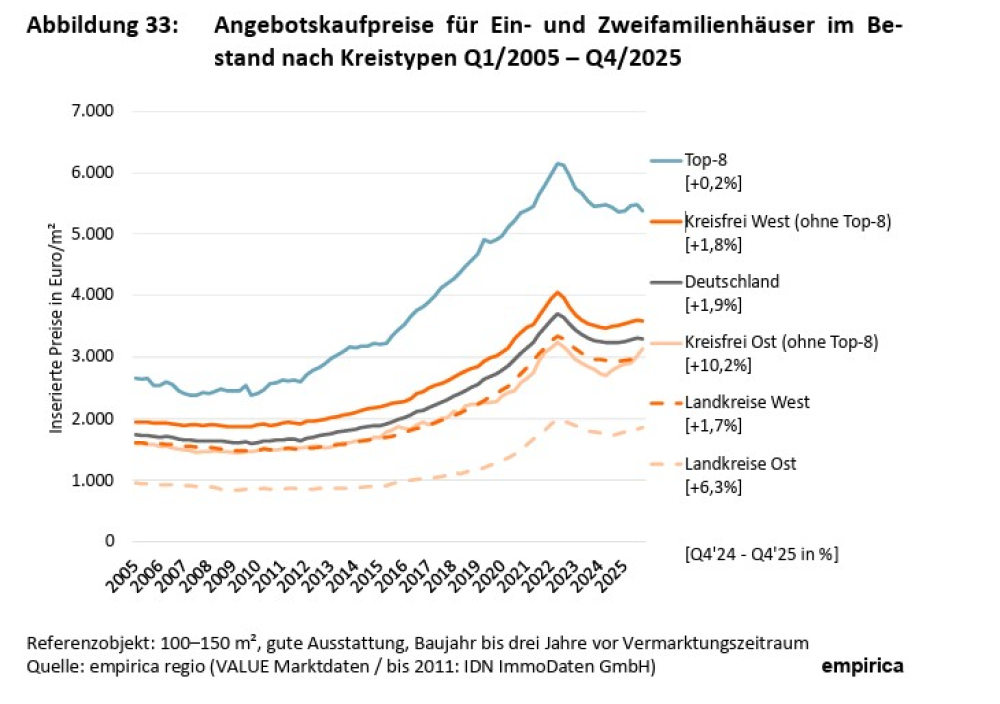 Hier verweisen die Studienautoren aber auf regionale Ausnahmen wie etwa einige ostdeutsche kreisfreie Städte, wo sich seit Ende 2023 eine deutliche Erholung der Preise zeigt. Für 2026 gehen die Experten von empirica aber angesichts der prognostizierten kurzfristigen Zinsentwicklung nicht von einer deutlichen Erhöhung der Angebotspreise aus. Mittelfristig könnten wegen der niedrigen Fertigstellungen Knappheitsaufschläge für einen stärkeren Anstieg der Preise für Ein- und Zweifamilienhäuser sorgen. (tik)