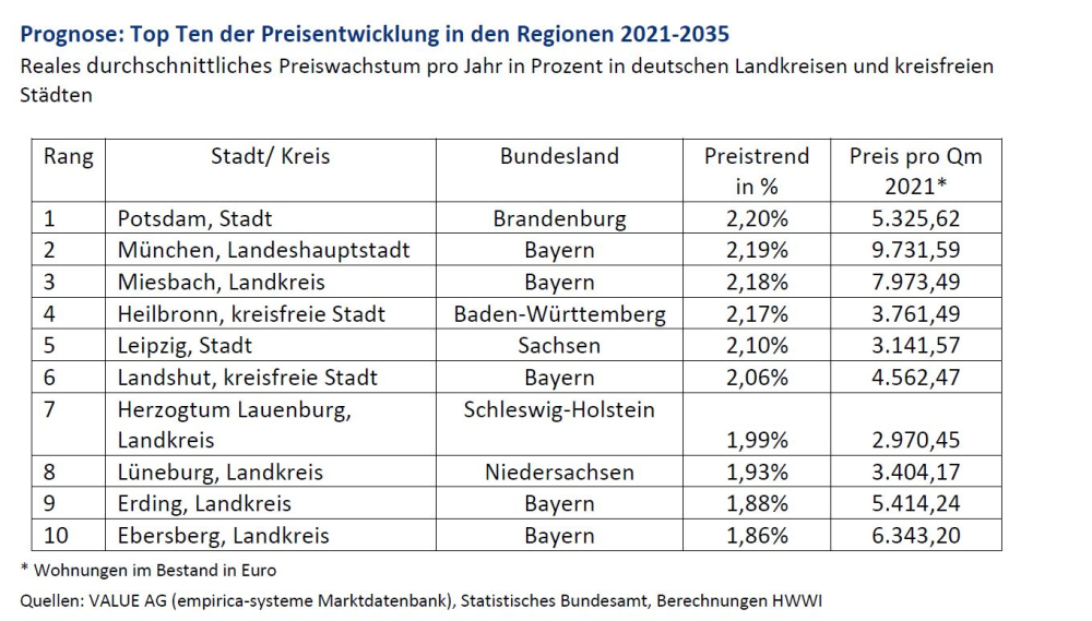 Potsdam dürfte mit realen Preiszuwächsen von mehr als 2% pro Jahr die voraussichtlich stärkste prozentuale Preissteigerung aller deutschen Regionen an den Tag legen. Was die künftige Preisdynamik bis 2035 angeht, erreicht Potsdam etwa das Niveau von München. Im Münchener Einzugsgebiet gehen die Experten für den Landkreis Miesbach ebenfalls von einem hohen Wertzuwachs aus. Auch in Landshut sowie in den Landkreisen Erding und Ebersberg im Münchener Umland dürfte es mit den Preisen bis 2035 deutlich bergauf gehen. Ebenfalls hohe jährliche Preisanstiege sind im Landkreis Herzogtum Lauenburg im Hamburger Umland und im Landkreis Lüneburg zu erwarten. In den Top Ten der Regionen mit den höchsten jährlichen Preisanstiegen finden sich außerdem Leipzig und Heilbronn.